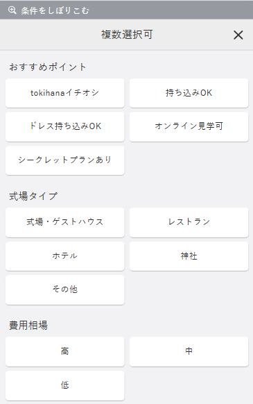 トキハナは「持ち込みOK」や「費用相場」など費用に直接する条件で検索できるのがうれしいです。